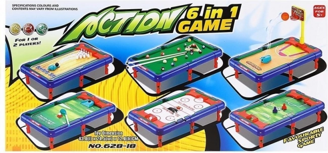 Dieses praktische Tisch-Set vereint sechs der beliebtesten Spiele in einem: Tischfußball, Billard, Hockey, Basketball, Kegeln und Golf. Kompakte Abmessungen ermöglichen die einfache Platzierung auf Tisch oder Boden sowie den schnellen Wechsel der Spielflächen. Ideal für Geschwister, Freunde und Familienturniere – den größten Spaß bietet das Spiel mit 2 Spielern.