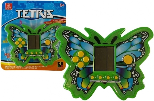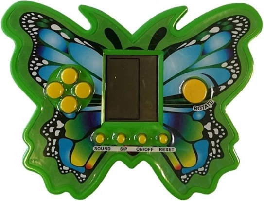 Das elektronische Tetris-Spiel in Schmetterlingsform bietet zeitlosen Spielspaß in einem kompakten und strapazierfähigen Design. Drehen und platzieren Sie die fallenden Steine so, dass Sie vollständige Reihen bilden und möglichst viele Punkte sammeln. Mit jeder entfernten Reihe steigt die Geschwindigkeit und das Spiel wird spannender.