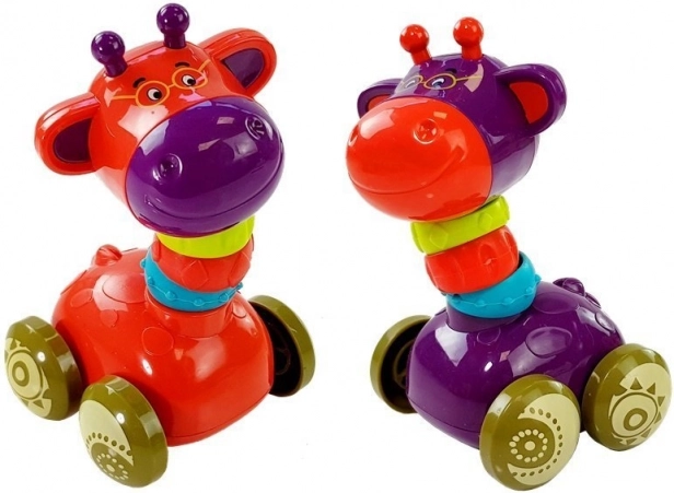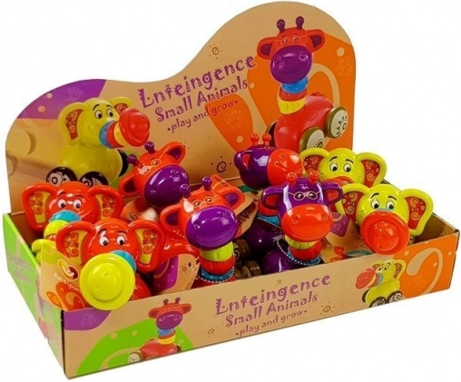 Diese farbenfrohen Spielzeuge verbinden beliebte Tiere mit kleinen Wägelchen, damit Kinder spielerisch ihre Fähigkeiten entwickeln können. Der elastische Elefantenrüssel und der Giraffenhals sind mit einem Gummiband befestigt, lassen sich ziehen und rasseln bei Bewegung angenehm. Der Elefant hat drei Gummiringe und einen Plastikhut am Rüssel, die Giraffe ist mit Ringen in Rot, Türkis und Grün geschmückt.