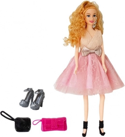 Puppen-Model Blondine 28 cm im rosa Kleid mit Handtasche, Pumps und Kamera. Zertifizierungen CE, EN 71. Tolles Geschenk für Kinder ab 3 Jahren.