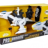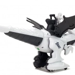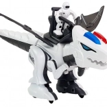 Der Roboter besteht aus robustem Kunststoff in einer weiß-schwarzen Farbkombination mit roten und blauen Details. Sein Design umfasst bewegliche Teile wie Flügel und Beine, wodurch der Dinosaurier lebendige Bewegungen ausführen kann. Ergänzt wird alles durch eine Reiterfigur, die den Dinosaurier „steuert“.