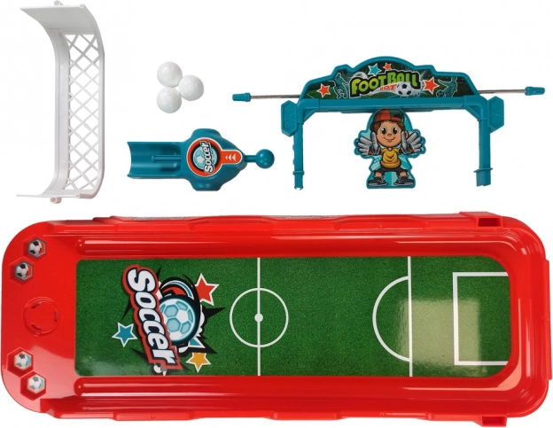 - Tischspielfeld mit Tor, Abschussmechanismus, 3 Kunststoffbälle, Punktekarten