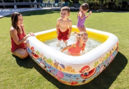 Das aufblasbare INTEX Kinderbecken mit Überdachung ist ideal für erfrischenden Sommerspaß im Garten. Die quadratische Form mit den Maßen 157 × 157 cm und einer Höhe von 122 cm bietet reichlich Platz zum Spielen, während das Fassungsvermögen von 280 l bei 20 cm Wasserstand sicheres und komfortables Planschen gewährleistet. Robustes Vinyl (0,25 mm) und weiche, aufblasbare Wände erhöhen Komfort und Sicherheit.