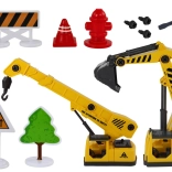 Fahrzeugbasis, Karosserie- und Cockpitelemente, Teile zum Bau von Bagger, Betonmischer und Kran, Schrauben, Schraubendreher mit Wechselbits, Zubehör (Schilder, Bäumchen, Hydrant, Pylon)