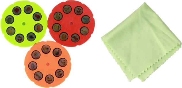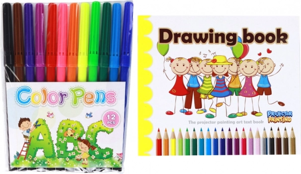 Im Lieferumfang enthalten ist vollständiges Kreativzubehör: 12 bunte Filzstifte, Zeichenheft und Tuch. Der Projektor wird mit 3× AA 1,5 V Batterien betrieben (nicht enthalten). Das Spielzeug fördert Feinmotorik, Konzentration und die Entfaltung der Fantasie.