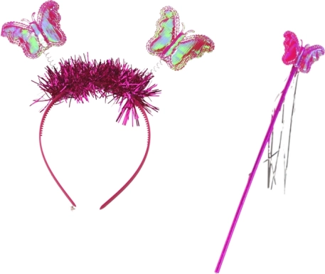 Passender Haarreif mit Schmetterlingen und glitzernder Zauberstab sorgen für Spaß und schöne Fotos. Ideal für Karneval oder Geburtstagsfeiern.