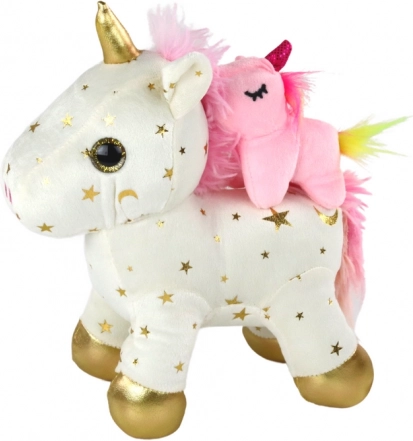 Das weiße Einhorn mit goldenen Sternchen, rosa Mähne und goldenen Hufen ist angenehm weich und lädt zum Kuscheln ein.