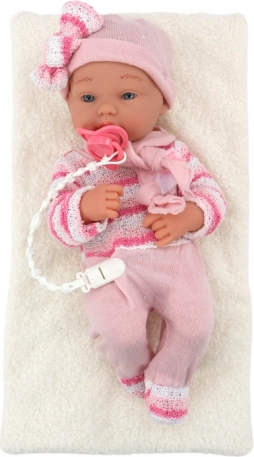 Die niedliche Babypuppe im rosa Outfit begeistert jedes Kind. Sie bietet bewegliche Arme und Beine, realistische Gesichtszüge und praktisches Zubehör, darunter einen Schnuller an einer Schnur und eine kuschelweiche Decke. Aus sicheren Materialien gefertigt, geeignet ab 18 Monaten.
