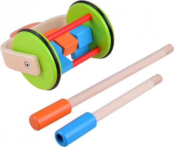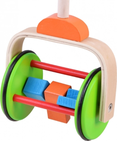 Das bunte Holzspielzeug zum Schieben ist so konzipiert, dass es Kinder bei ihren ersten Schritten unterstützt. Es hat einen an die Körpergröße des Kindes angepassten Griff mit Regulierungsmöglichkeit. Die Räder sind mit einem Gummiband versehen, um einen reibungslosen Betrieb und Schutz für den Fußboden zu gewährleisten.