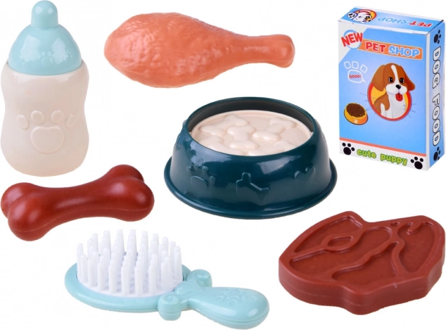 Plüschhund, tragbare Transportbox, Bürste, Fütterungsflasche, Napf mit Futter-Imitat, Knochen, Hähnchenkeule, Steak, Box mit Futter-Imitat, Aufkleber