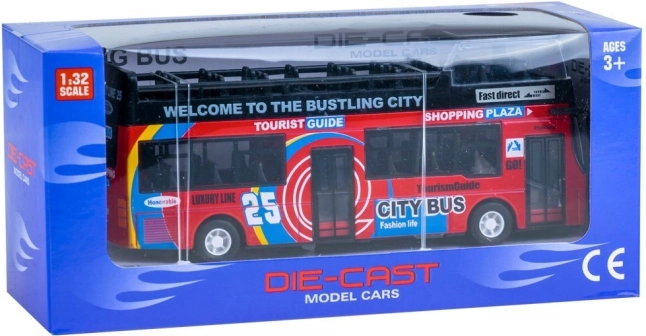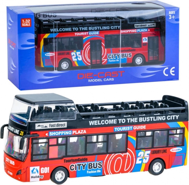 Metall-Doppeldeckerbus mit Friktionsantrieb, Licht, Sound und öffnenden Türen. Robuste Konstruktion, detailreiche Ausführung. Die ideale Spielzeugwahl für kleine Fahrer.