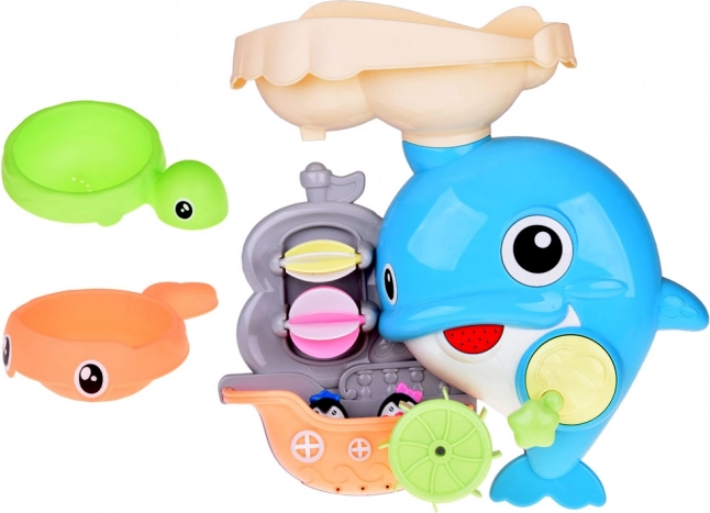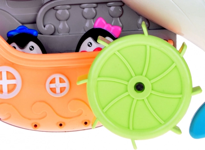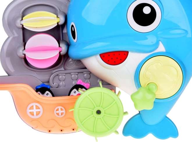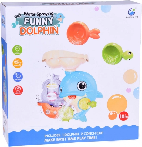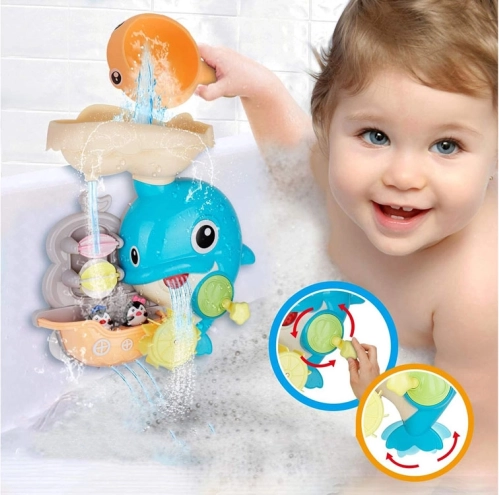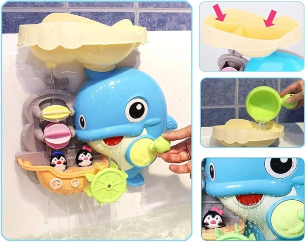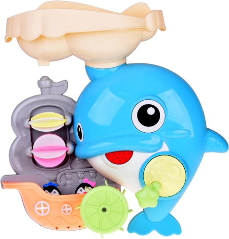 Der fröhliche Badedelfin ist ein farbenfrohes interaktives Spielzeug, das Kinder zu Wasserexperimenten einlädt. Einfach Wasser in den oberen Tank gießen und beobachten, wie sich die Wasserräder drehen, ein Wasserfall startet und sich die Delfinflosse bewegt. Das Boot mit den kleinen Pinguinen regt Geschichten beim Baden an.