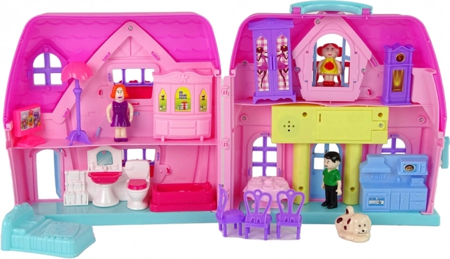 Rosa Puppenhaus mit Möbeln und Figuren