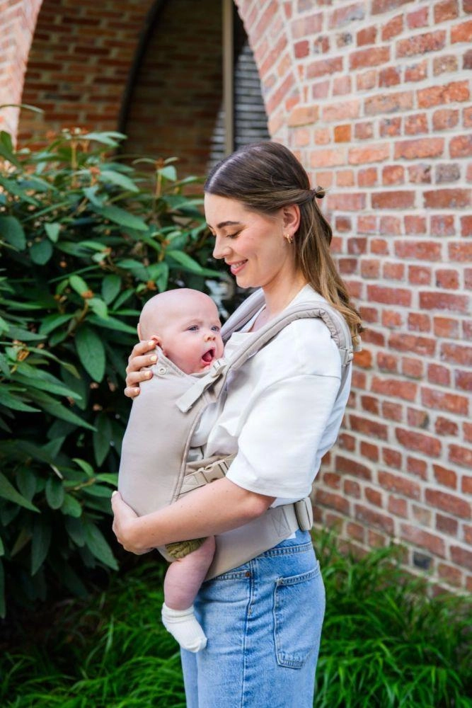 Dank des breiten Hüftgurts, der gepolsterten Schultergurte und der weichen Schnallenabdeckungen verteilt die Trage das Gewicht gleichmäßig und bleibt auch bei längerem Tragen angenehm. Die abnehmbare Kapuze schützt den Kopf vor Wind und Licht, die praktische Tasche fasst kleine Gegenstände und Gummizüge an den Gurtenden halten überschüssige Bänder ordentlich verstaut.