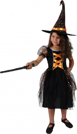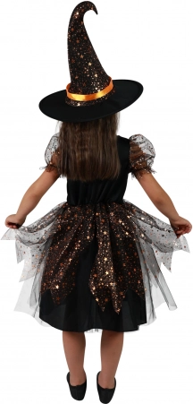 Das Kleid ist reich mit orangen Elementen und metallischen Sternen verziert, die auf den ersten Blick faszinieren. Zum Kostüm gehört auch ein Hexenhut, der dem Set ein authentisches Aussehen verleiht.