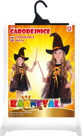 Entdecken Sie das magische Karnevalskostüm einer Hexe, das für Mädchen im Alter von 8-10 Jahren gestaltet ist. Schwarzes Kleid mit orangen Bändern und metallischen Sternen verleihen einen beeindruckenden Look. Vergessen Sie nicht den Hexenhut, der das ganze Kostüm perfekt ergänzt.