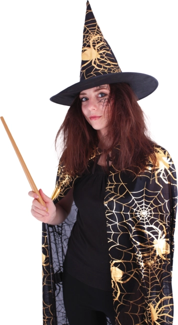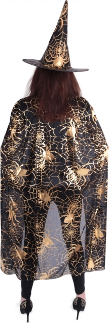 Der schwarze Umhang mit goldenen Spinnennetzen und Spinnen glänzt im Licht und zieht auf jeder Party die Blicke auf sich.