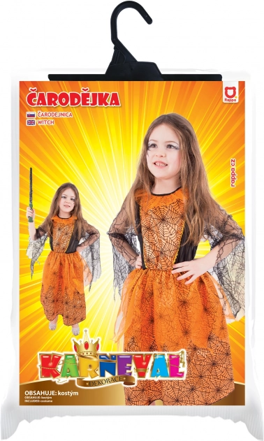 Mädchen-Hexenkostüm mit Spinnennetz in Größe M für 6–8 Jahre (117–128 cm). Schwarz‑orangefarbenes Kleid für Halloween und Karneval, bequem und auffällig.