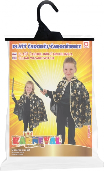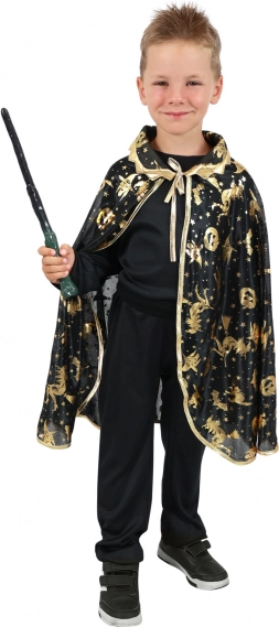 Der schwarze Kinder-Hexenumhang mit goldenen Drucken von Sternen, Monden und weiteren Motiven verwandelt jedes Kind im Handumdrehen in einen kleinen Zauberer. Er ist leicht, angenehm zu tragen und dank der Bindung am Hals einfach anzuziehen.