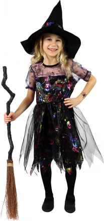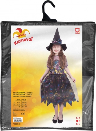 Schenken Sie der kleinen Hexe das perfekte Kostüm, das auf jeder Party heraussticht. Das leichte, angenehm zu tragende Kleid in Schwarz‑Lila wird von bunten Halloween-Motiven geziert und verleiht dem Outfit einen verspielten, magischen Look. Ein passender spitzer Hut rundet den klassischen Hexenstil ab.