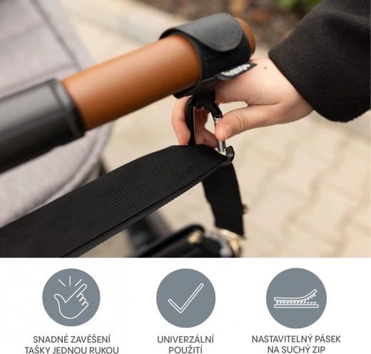 Der robuste Metallkarabiner trägt die tägliche Belastung, und der hochwertige textile Gurt ist schonend zum Kinderwagengriff. Das minimalistische schwarze Design passt zu jedem Stil und jeder Wagenfarbe.