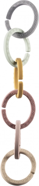Der multifunktionale Silikon-Beißring und die Kette sind aus lebensmittelechtem Silikon gefertigt, das ungiftig und bruchsicher ist. Dank der verschiedenen Texturen und des einfachen Griffs eignet sich der Beißring für jede kleine Hand und lindert Zahnungsschmerzen. Neben dem Beißring können Sie die Ringe auch zur Befestigung von Spielzeug am Kinderwagen oder als Schutz vor Sonne und Wind mit einem Tuch verwenden.