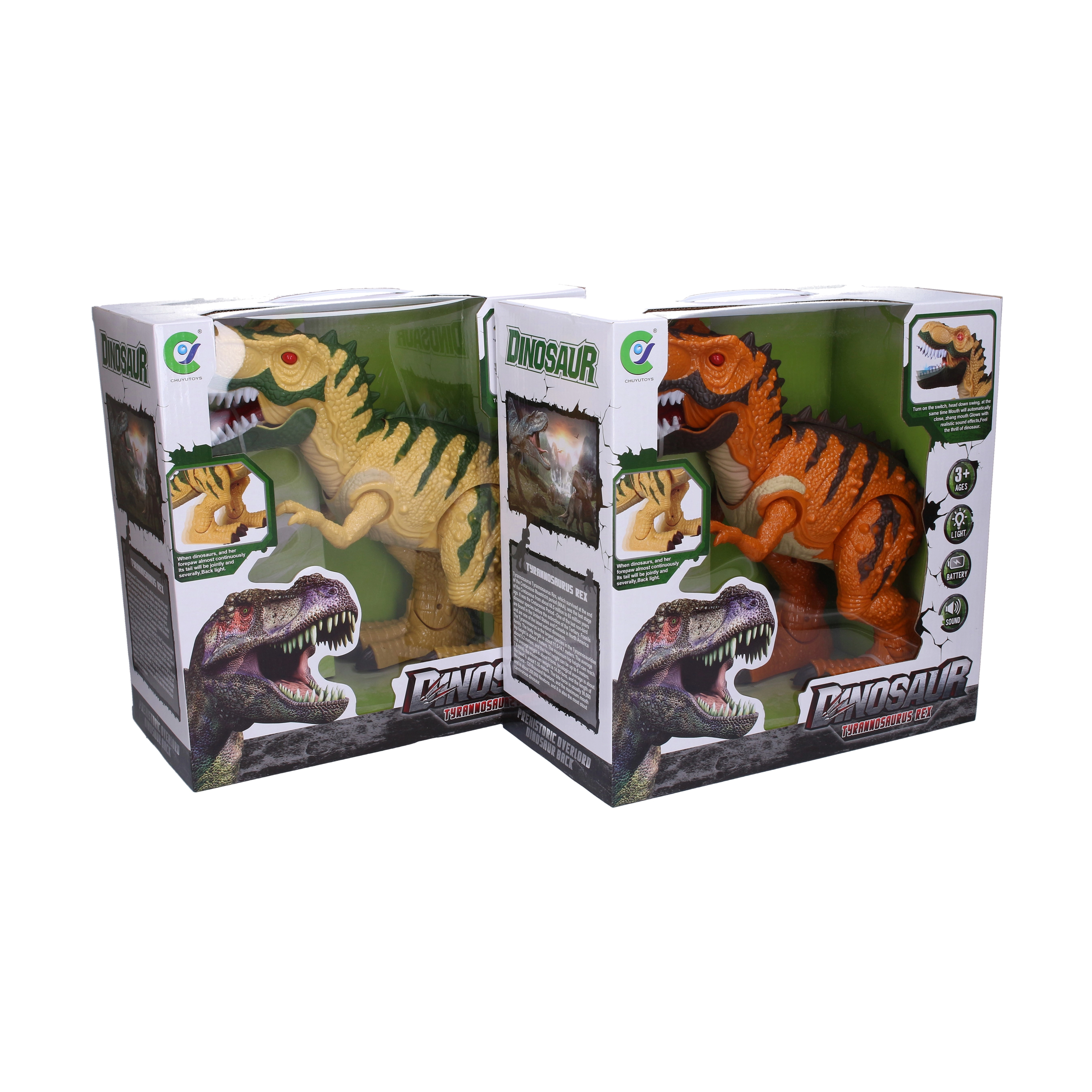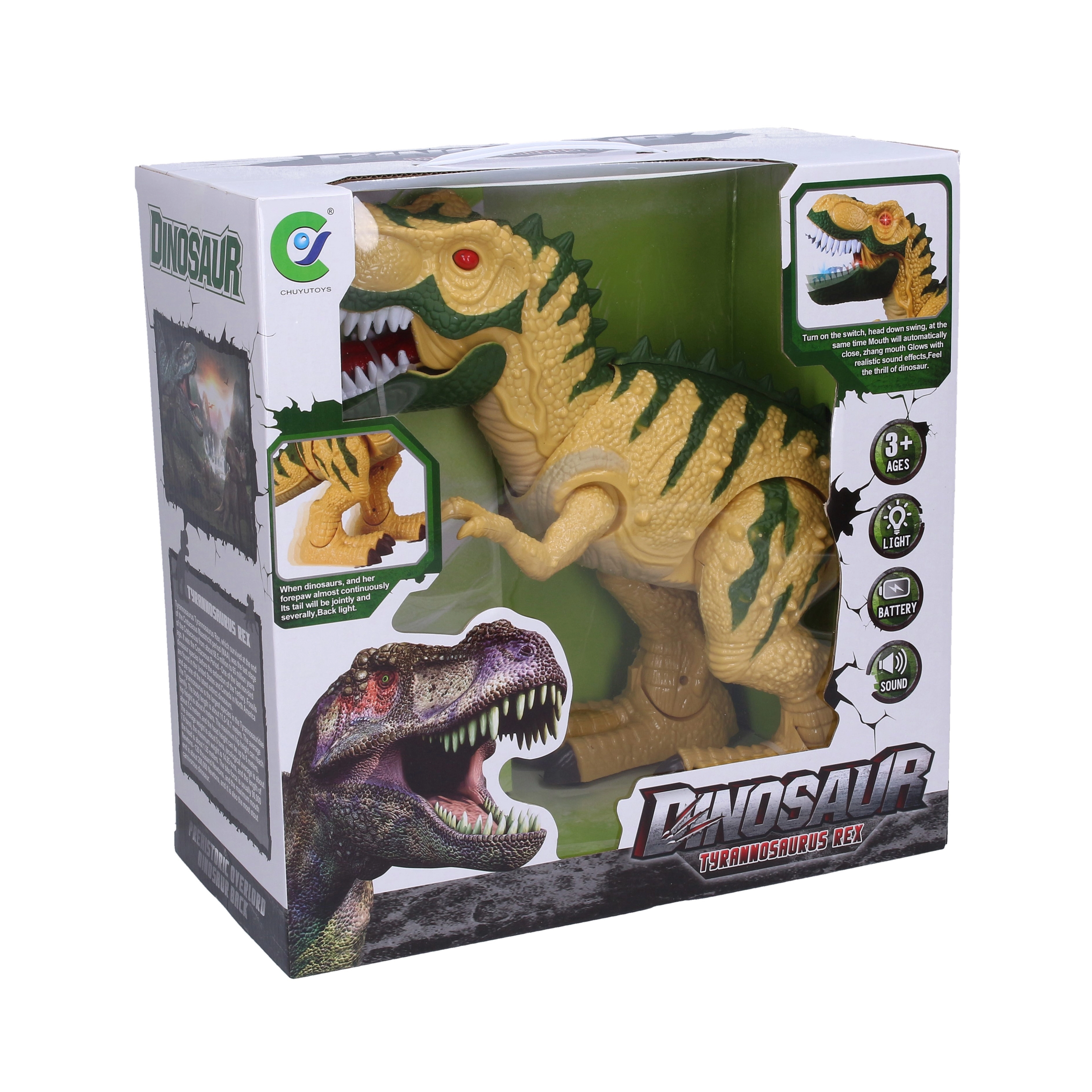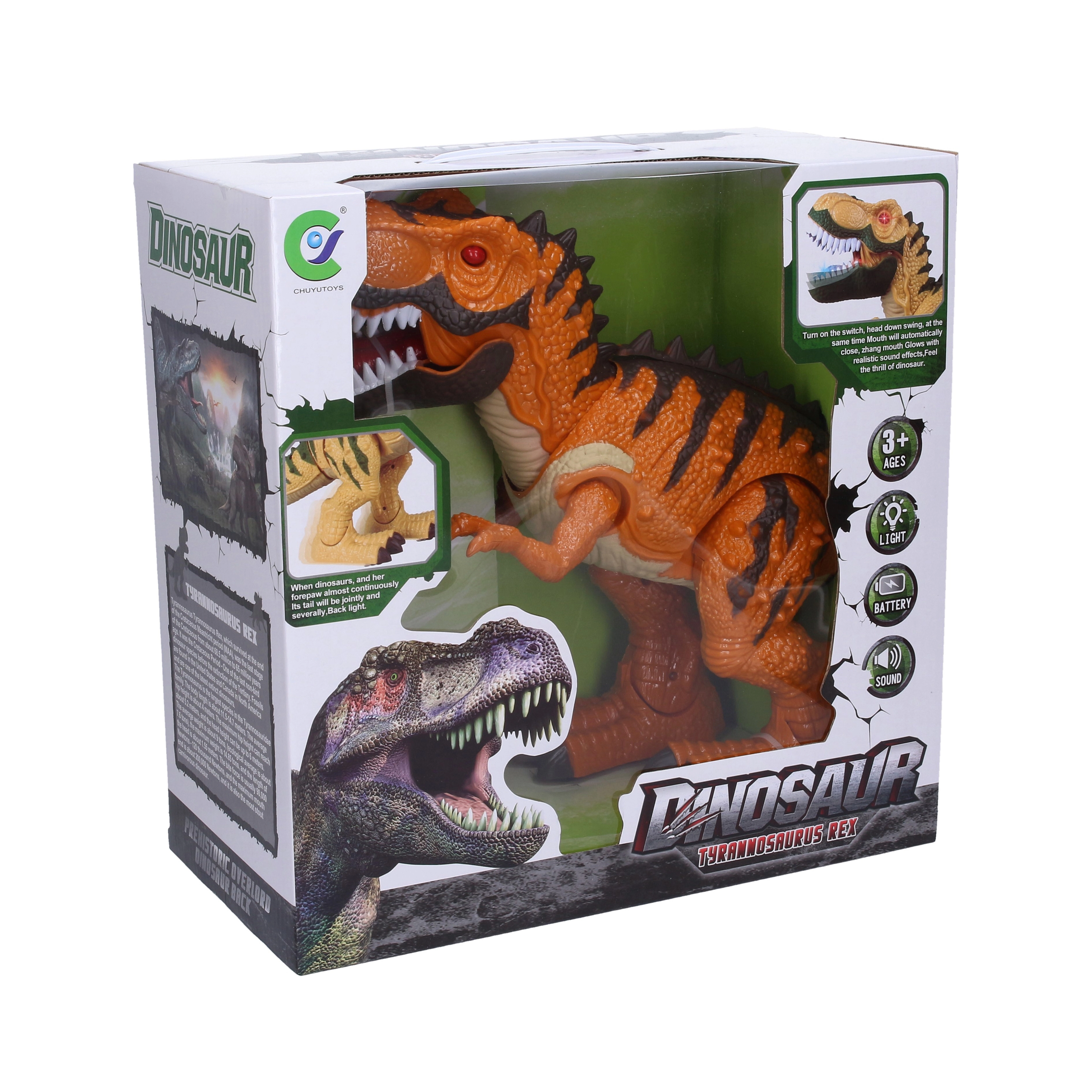 • Bewegung und Effekte – der Dinosaurier geht, öffnet das Maul und gibt Geräusche von sich.