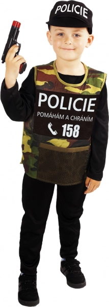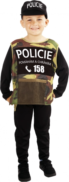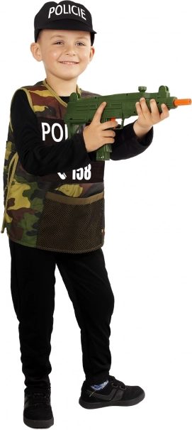 Verwandeln Sie Ihr Kind in einen echten Helden mit dem Polizistenkostüm, das einen schwarzen Overall, eine tarnfarbene Weste mit der Aufschrift POLIZEI und eine Mütze enthält. Ideal für Kinder von 4 bis 6 Jahren.