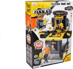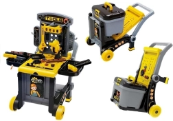 Dieses durchdachte Set für kleine Heimwerker kombiniert eine Werkbank mit Seitenablagen, einen umrüstbaren Wagen für den einfachen Transport des Werkzeugs und eine praktische Box für Kleinteile. Ideal für Kinder ab 3 Jahren und hilfreich zur Förderung von Geschicklichkeit, Hand-Auge-Koordination und Geduld beim Schrauben, Hämmern und Bauen.