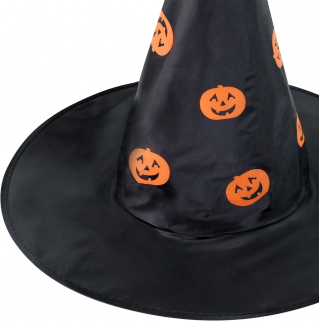 Kinder-Hexenhut mit orangefarbenen Kürbissen für Halloween. Leichtes und bequemes Kostüm-Accessoire. Für Kinder ab 3 Jahren, Abmessungen 380×340×380 mm.