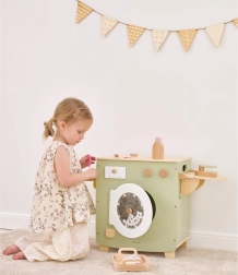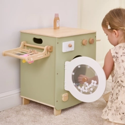 Diese hochwertige Holz-Waschmaschine in sanftem Pastellgrün mit natürlichen Akzenten bietet Kindern ein authentisches Erlebnis von Waschen, Trocknen und Bügeln. Bedienelemente, transparente Tür und das seitliche klappbare Trockengestell mit Klammern sorgen für viele Stunden sinnvolles Spiel und Fähigkeitsentwicklung.