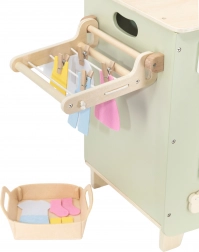 Das seitliche ausklappbare Trockengestell mit kleinen Klammern ist ideal zum Aufhängen von Filzkleidung und zum Erlernen von Sorgfalt bei Haushaltstätigkeiten.