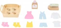 Zum Set gehören außerdem Zubehörteile wie Waschmittel, Wäschekorb, Filzkleidung und ein Holz-Bügeleisen. Dank der robusten Holzausführung und glatten Kanten ist das Spielzeug sicher und strapazierfähig für den täglichen Einsatz.