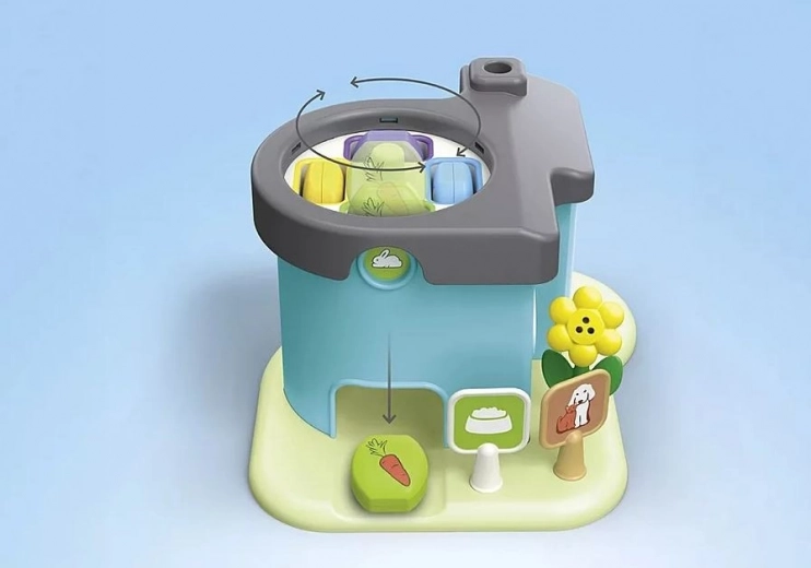 Dieses zauberhafte Tierhotel wurde so gestaltet, dass es Kleinkinder und Vorschulkinder begeistert. Der im Dach integrierte Futterspender unterstützt logisches Denken und Koordination: Kinder werfen die bunten Futterstücke ein, drehen das Dach und beobachten, wie das Futter über die Rutsche zum richtigen Tier gelangt. Jedes Tier hat sein farblich abgestimmtes Häuschen und seine Portion Futter – so wird das Erkennen von Farben ganz natürlich geübt.
