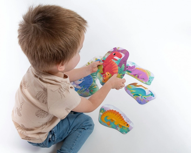Jeder Dinosaurier ist ein eigenes Puzzle mit vereinfachter Form. Kinder üben das Zusammenlegen und entdecken dabei die Welt prähistorischer Tiere.