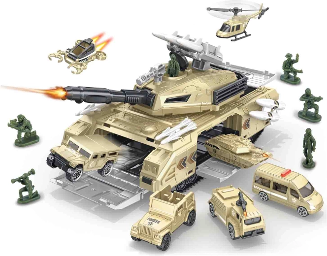 Militärstation mit Panzer. Größe des großen Panzers: 26 cm, der kleinen Fahrzeuge: 7–8 cm. Freilaufende Räder. Enthält: großen Panzer, 2 militärische Transportfahrzeuge, 10 Soldatenfiguren, Waffen, Aufkleber. Bildliche Aufbauanleitung auf der Rückseite der Verpackung.