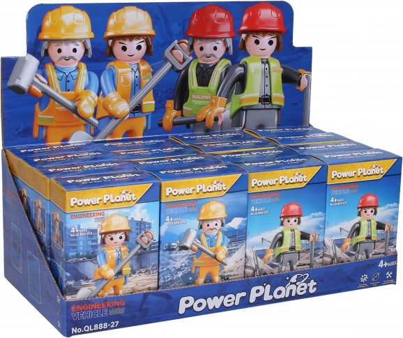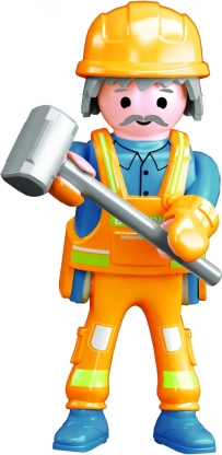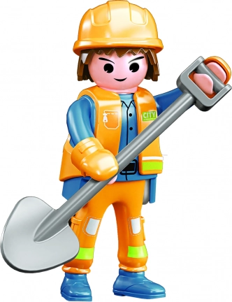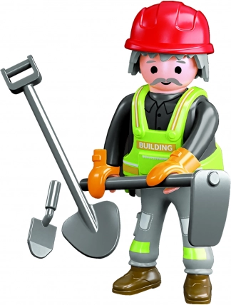 Bauarbeiter-Figur für ein Bauset mit einer Größe von 7 cm ist ideal für alle kleinen Baumeister. Das Paket enthält verschiedene Varianten und Zubehör, wie Werkzeuge und eine Bauanleitung.