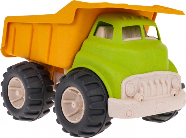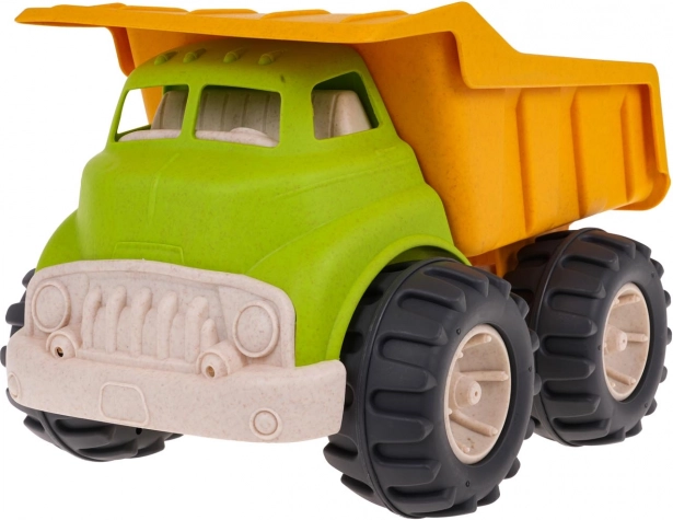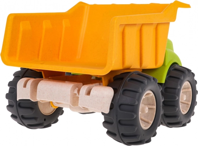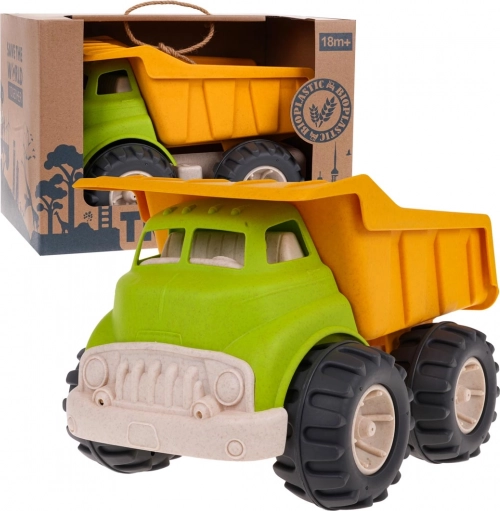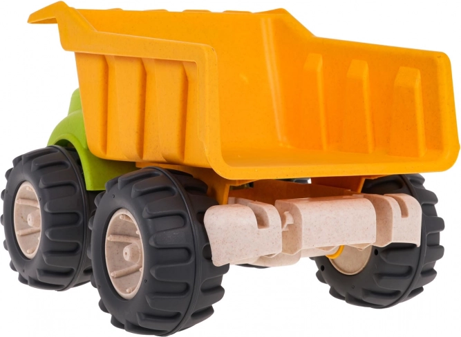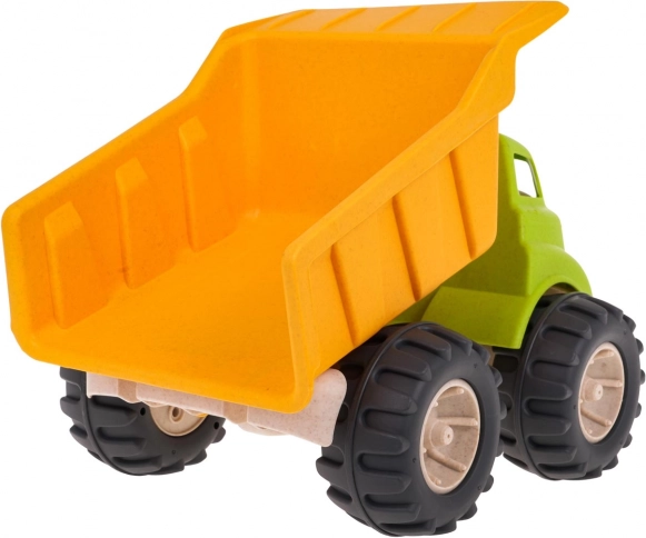 Kipplaster aus Bioplastik für Kinder ab 18 Monaten, hergestellt aus umweltfreundlichen Materialien, die sicher für Kinder und schonend für die Umwelt sind. Bietet bewegliche Elemente für kreatives Spielen und dank der großen Räder ideal für das Spielen im Freien.