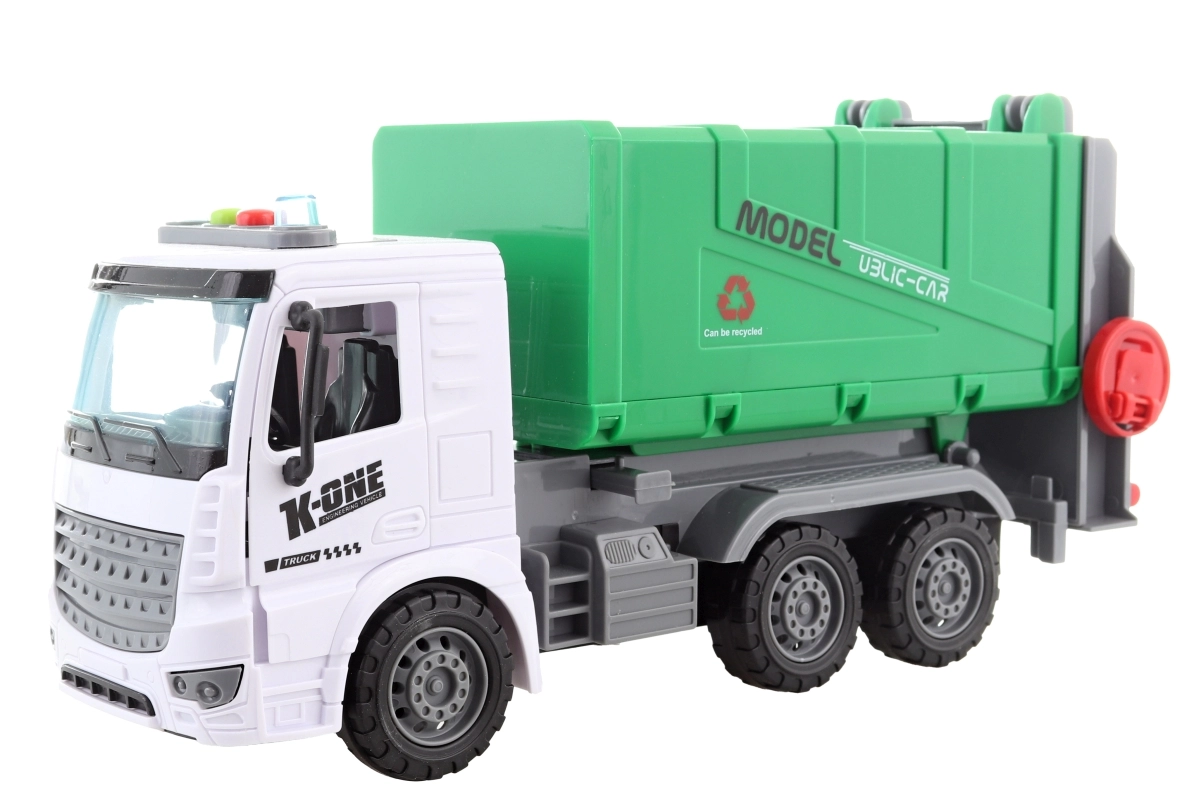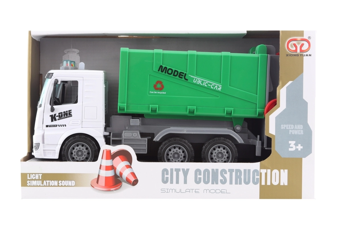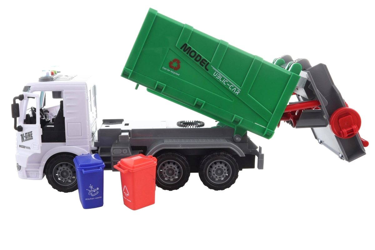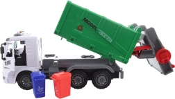 Plastik-Müllabfuhrfahrzeug mit Batteriebetrieb. Über zwei auf der Kabine angebrachte Tasten gibt es Fahr- und Rückfahrgeräusche wieder. Enthält 2 Mülltonnen; mit Hilfe eines Rads können die Tonnen entleert werden. Batterien 3x AG13 sind im Lieferumfang enthalten. Der hintere Teil des Abfallbehälters lässt sich manuell öffnen. Verpackt im Karton. Verpackungsmaße ca. 32 × 11,5 × 18,5 cm. Fahrzeugmaße ca. 28 × 14 × 8,5 cm. Alter 3+.
