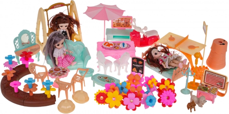 Mit dabei sind eine komplette Möblierung, eine Gartenschaukel, ein Sonnenschirm, Tiere und ein Roller. Die drei Puppen haben bewegliche Gliedmaßen und langes Haar, ideal zum Kämmen.