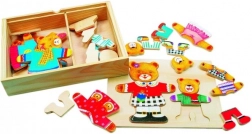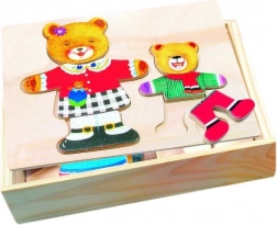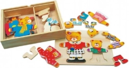 Holzanzieh-Puzzle von Bino bietet Spaß und Bildung in einer praktischen Verpackung. Kinder können die Teile in den Deckel der Schachtel einlegen und verschiedene Outfits für die Bären nach ihrer eigenen Fantasie kreieren.
