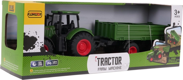 Traktor mit Anhänger im Maßstab 1:24, für Kinder ab 3 Jahren. Der Traktor wurde sehr realistisch nach einer echten landwirtschaftlichen Maschine mit detaillierten Details nachgebildet. Er besteht aus hochwertigstem Kunststoff in lebendigen Farben. Große Gummireifen sorgen für guten Grip. Der Anhänger des Traktors kann abgekoppelt werden; außerdem lassen sich die Seitenwände absenken und die Heckklappe anheben.