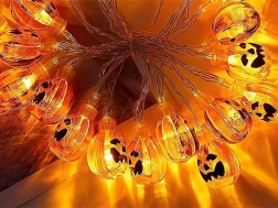 Die Länge der Kette beträgt ca. 195 cm, die Abstände der Kürbisse etwa 19 cm. Die kompakten Kürbisse (ca. 3 × 2 cm) wirken dezent und unterstreichen dennoch wirkungsvoll die Halloween-Deko.