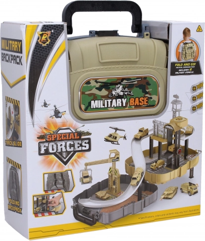 Abenteuerset für kleine Armee-Fans: Militärstation mit Rennstrecke, Aufzug, Kran, Heliport und 2 Autos im praktischen Rucksack mit Trägern. Ideal für zu Hause und unterwegs, mit Bildanleitung für einfaches Aufbauen.