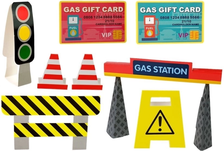 Ampel, Schilder, Hütchen, Barriere und Karten für die Zapfsäule verleihen dem Spiel Verkehrsregeln und eine realistische Atmosphäre.