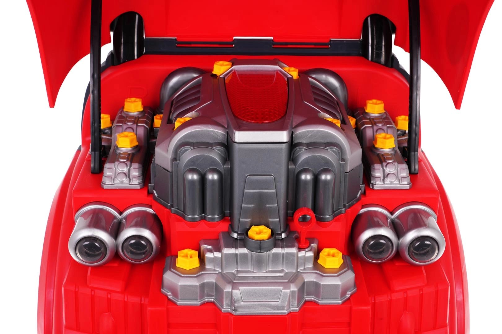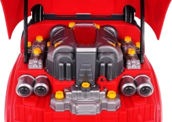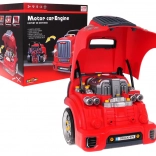 Unter der Haube wartet ein großer Motor, der verschraubt und in Teile zerlegt werden kann – ideal zum Trainieren von Feinmotorik und Logik.