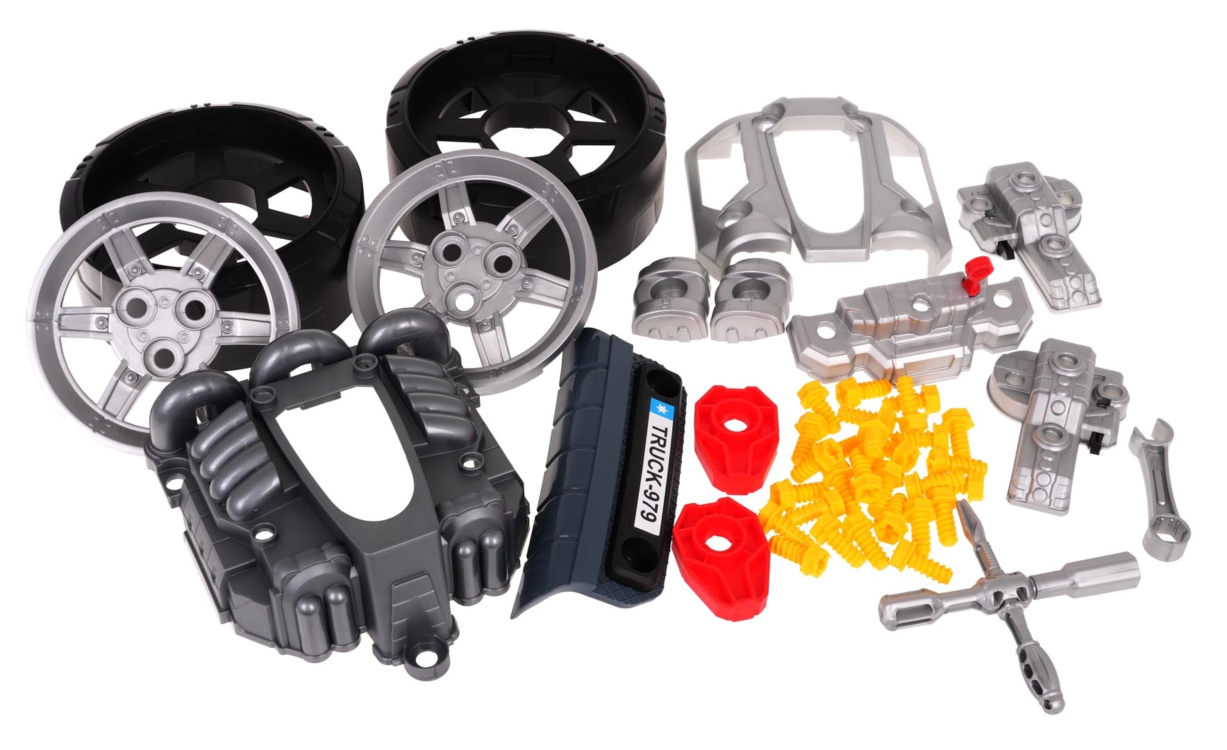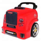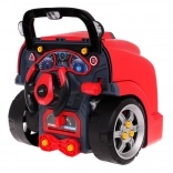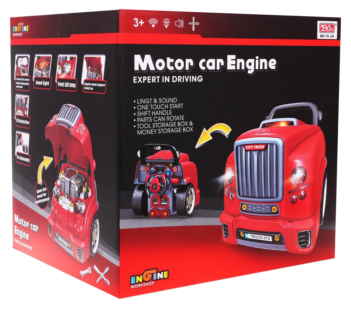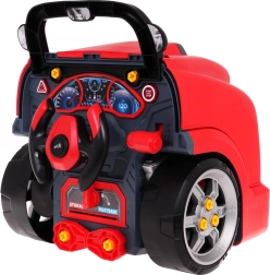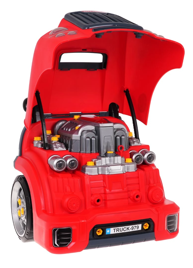 Dieses realistische, interaktive Set verwandelt Kinder in geschickte Mechaniker. Die Front des Lastwagens mit hochklappbarer Motorhaube verbirgt einen großen, zerlegbaren Motor, bei dem sich Zündkerzen und Räder wechseln lassen. Auf dem Armaturenbrett befinden sich Startknopf mit Startgeräuschen, Lenkrad mit Hupe, Warnanzeige und Schalthebel. Ein praktischer Tragegriff erleichtert den Transport, unter dem Lenkrad gibt es ein Fach für Werkzeug und Schrauben.