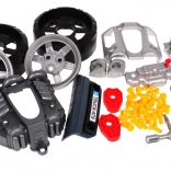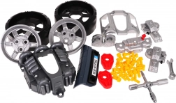 Im Lieferumfang enthalten sind Räder mit Radkappen, 31 Schrauben, Werkzeug, dekorative Aufkleber und eine Anleitung. Lichteffekte der Scheinwerfer und des Motors sowie Fahr- und Rückfahrgeräusche halten kleine Autofans lange bei Laune.