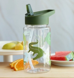Transparente Kindertrinkflasche von A Little Lovely Company mit verspieltem Krokodil-Motiv. Sie ist auslaufsicher, leicht und ideal für den Kindergarten, den Spielplatz und Ausflüge. Fassungsvermögen 450 ml, robustes Tritan-Material mit Deckel und Trinkhalm für komfortables Trinken.