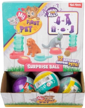 Diese niedliche Überraschungskugel MY FIRST PET erfreut jeden kleinen Tierfreund. Im Inneren befindet sich eine Figur eines Hündchens oder Kätzchens sowie drei Zubehörteile für spielerisches Pflegen eines Haustiers.